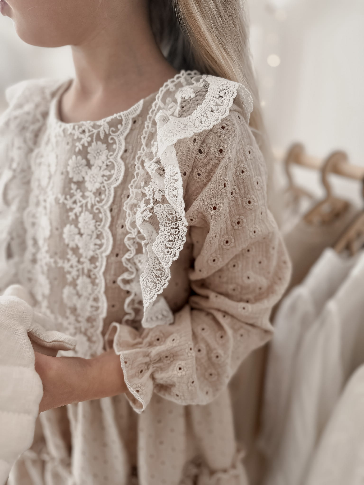 Beiges Kleid Flori aus Baumwoll-Musselin mit schöner Stickerei, besetzt mit Spitze in Ecru.