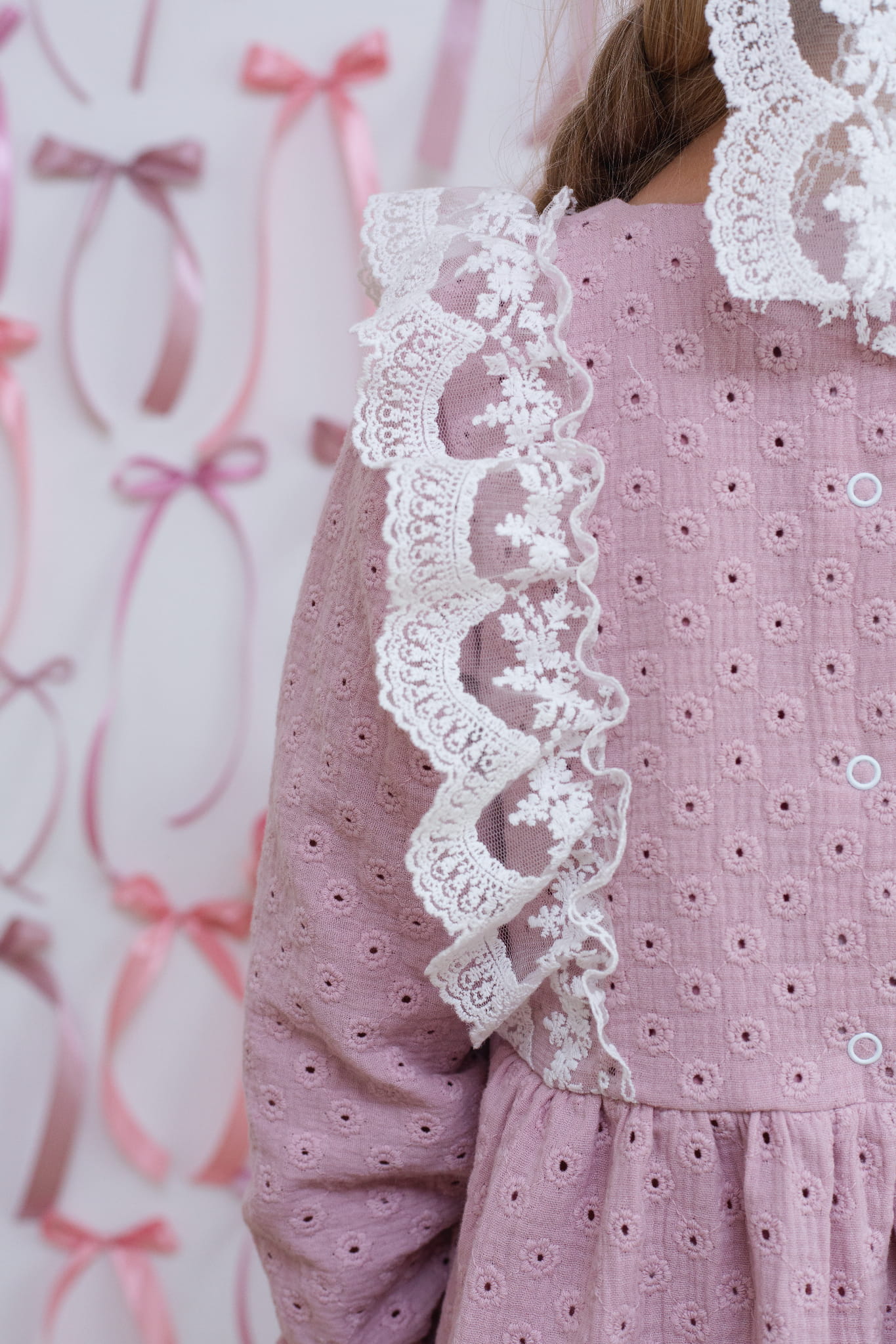 Rosa Kleid Flori aus Baumwoll-Musselin mit schöner Stickerei, besetzt mit Spitze in Ecru.